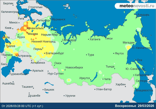 В умеренных широтах Европейской части России еще сохранится влияние антициклона. Температурный фон здесь по-прежнему опережает норму почти на 5-7 градусов. При переменной облачности осадки маловероятны. Атмосферное давление и содержание кислорода в норме....