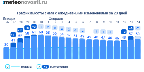 На опорной метеостанции Москвы ВДНХ и в районе МГУ сугробы потеряли 7 см, и на утро 14 февраля высота составляет 50-55 см соответственно. Снежный покров на 4-5 см уменьшился в районе Звенигородского шоссе, в Зеленограде и Кузьминках. В районе МГУ снега потеряли, что по-прежнему выше нормы. Наиболее интенсивное таяние снега наблюдалось в центре Москвы на Балчуге, в Коньково на 12 см, а в Митино и вовсе на 18.