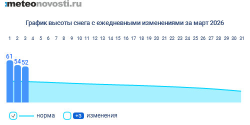 Снежный покров Москвы продолжает нести существенные потери ИА "Метеоновости" / 11:03 Вторник, 3 марта Холодный фронт с момента прохождения через столицу в послеобеденные часы 2 марта и до утра 3 марта принес в Москву осадки в количестве 4 мм. Но так как осадки выпадали не только в виде дождя, но мокрого снега и снега, то потеря высоты снежного покрова за сутки на положительном фоне температуры воздуха составила в среднем около 5 см. Минимальные потери понесли сугробы в районе ВДНХ – всего 2 см, в результате на сегодня здесь 52 см.