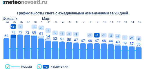 На главной метеостанции ВДНХ сугробы подтаяли 2 см, и утром 15 марта осталось 35 см. В центре Москвы – на Балчуге - высота снежного покрова уменьшилась на пару сантиметров и сейчас 37 см. Больше всего 7 см потеряли сугробы МГУ, и утром воскресного дня осталось только 35 см. В целом, по столице высота снежного покрова сокращается на 1 см, а кое-где существенно не меняется, как, например, в Зеленограде, замерла на отметке 15 см.