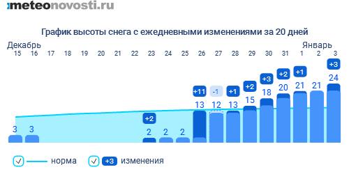 Снежный покров в Москве растет ИА "Метеоновости" / 10:10 Суббота, 3 января ![]() Высота снежного покрова в Москве утром 3 января составила 24 см, что на 3 см выше, чем вчера и выше климатической нормы.