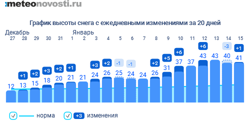 В Подмосковье высота снега разная. В Дмитрове она уменьшилась на 3 см и составляет 35, а в Клину высота сугробов не изменилась и все те же 34 см. В Волоколамске снежный покров не изменился – 40 см, в Можайске он подрос на пару см и достигает 36. На юге Московской области снег осел на 1 см, в Кашире 45, в Коломне 52 см. Сегодня в столичном регионе сколько-нибудь существенных осадков не ожидается, поэтому и высота снежного покрова вряд ли подрастет. / meteonovosti.ru /