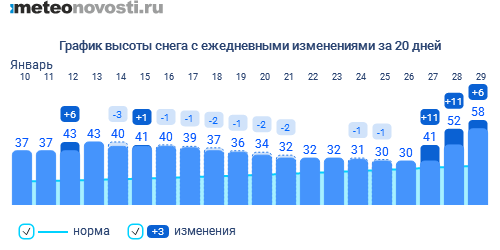 Утопает в снегах и Подмосковье. Сугробы высотой 63 см стоят в Коломне, в Кашире 61 см, в Волоколамске 60, в Клину 56. Сегодня снегопад продолжится, и высота снежного покрова еще может подрасти на 2-5 см. Листая метеорологические летописи, самые высокие снега 29 января, зафиксированы на ТСХА и в районе МГУ 57 см. Велика вероятность, что на ВДНХ может быть обновлен рекорд 1994 года, тогда 29 января высота составляла 61 см, и до него ы нынешнем году осталось всего лишь 3 см. / meteonovosti.ru /